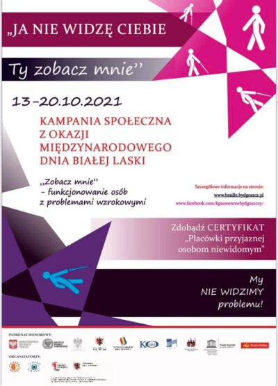 W dniach 13-20 października 2021 r. nasza placówka wzięła udział w kampanii społecznej z okazji Międzynarodowego Dnia Białej Laski „Ja nie widzę Ciebie, Ty zobacz mnie”.![]()