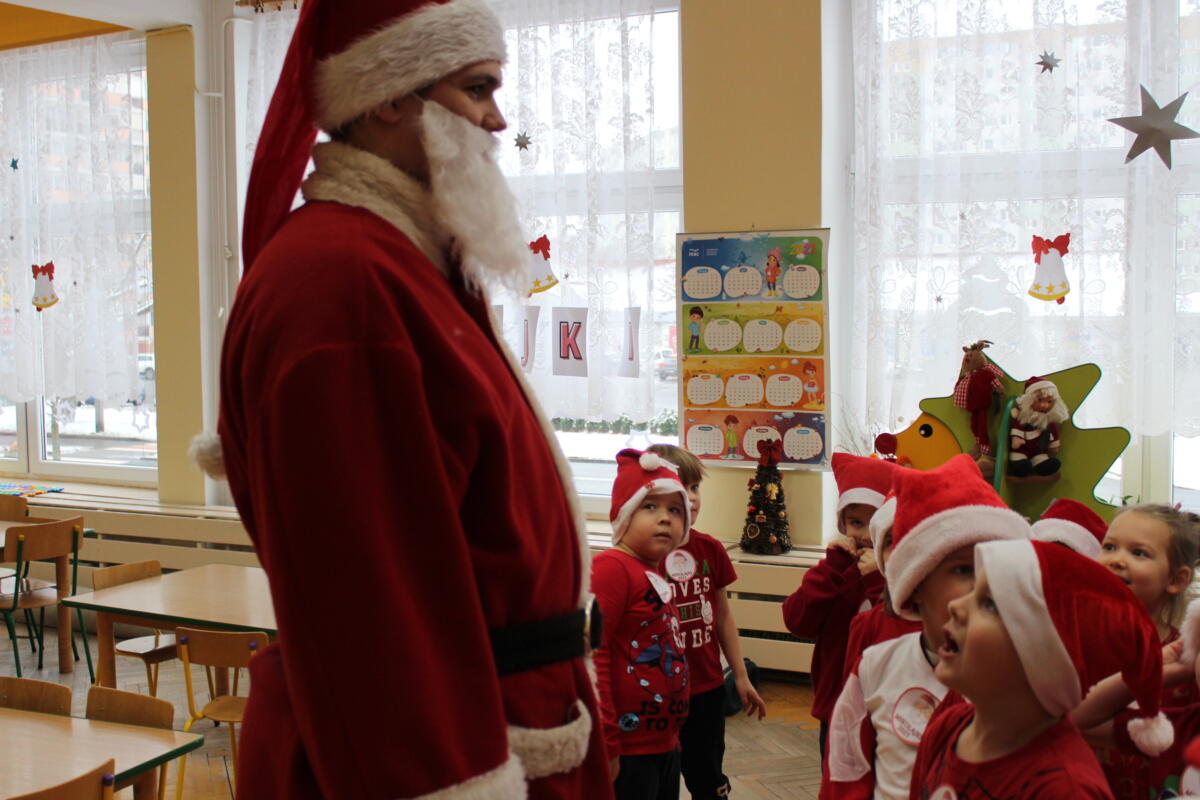 Po śniadaniu Mikołaj odwiedził dzieci w klasach . Dzieci zadawały mu pytania , śpiewały piosenki i recytowały wierszyki oraz uczestniczyły we wspólnej zabawie . Mikołaj obiecał dzieciom prezenty, które zostawił dla nich w bucikach.