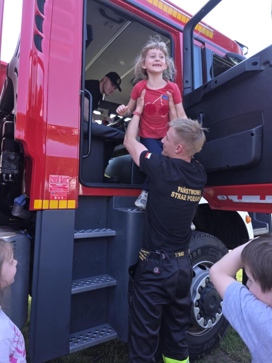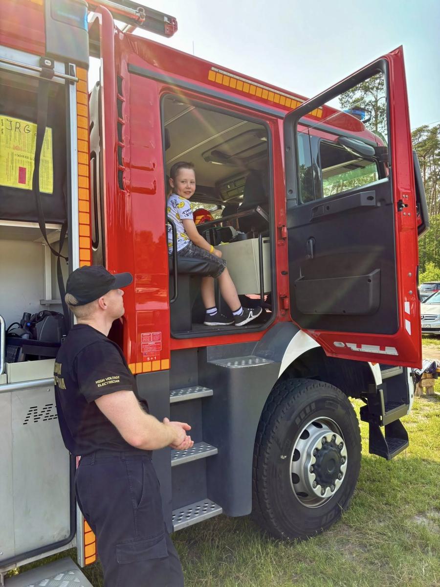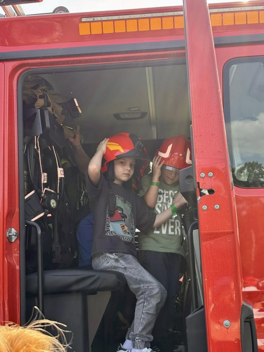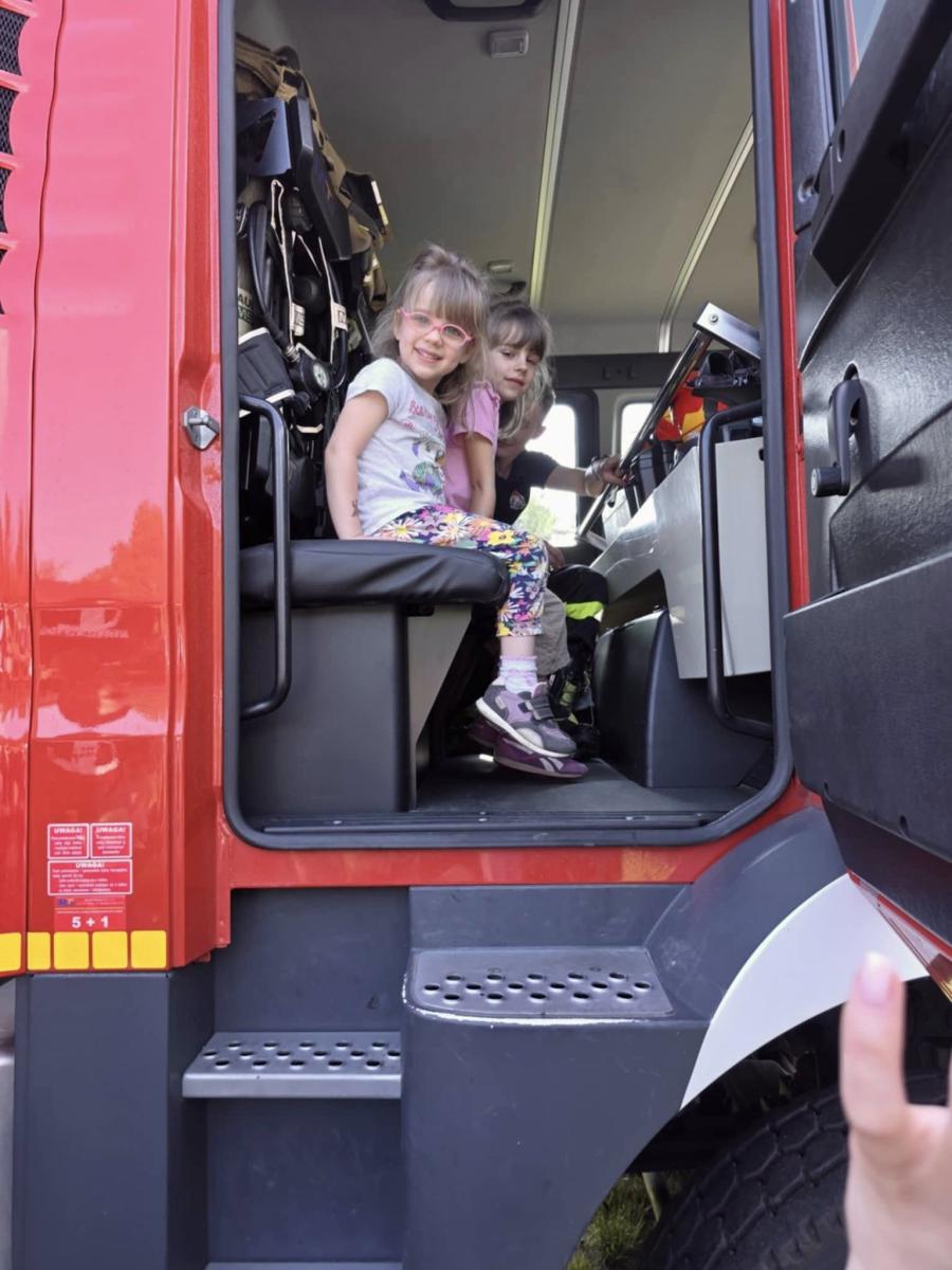 . Dzieci z ogromnym entuzjazmem wspinały się do środka, gdzie mogły zobaczyć, jak wygląda wyposażenie wozu. Miały także okazję przymierzyć hełm i poczuć się jak prawdziwi strażacy