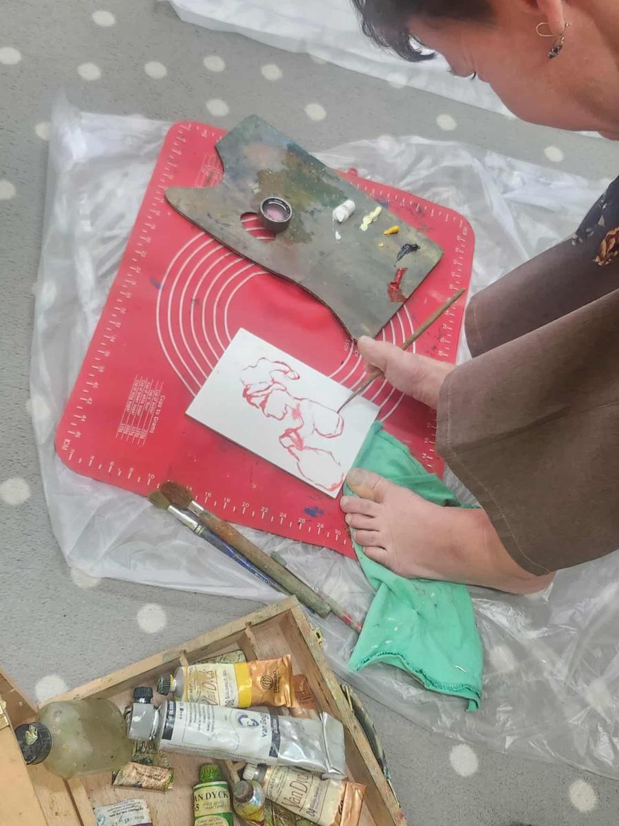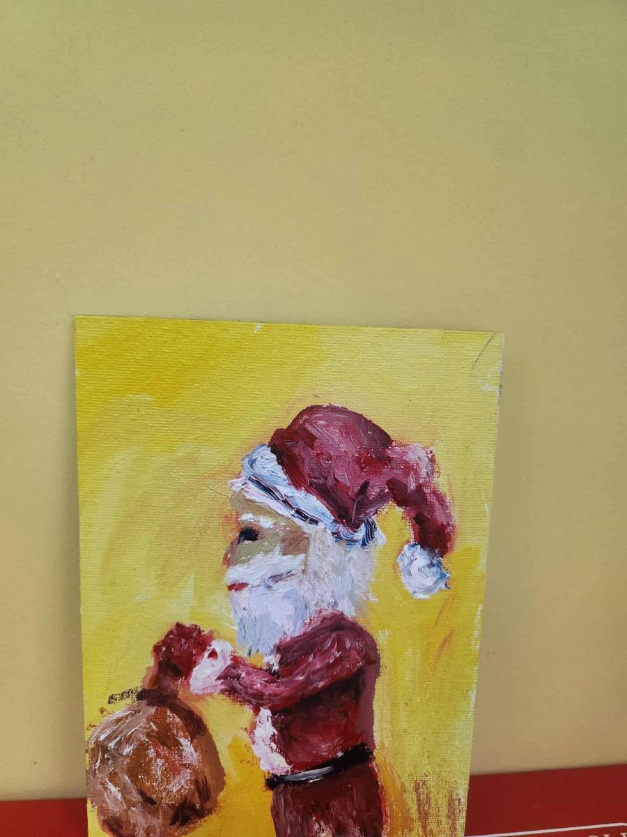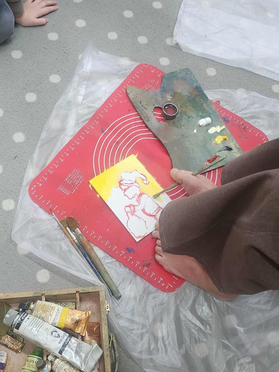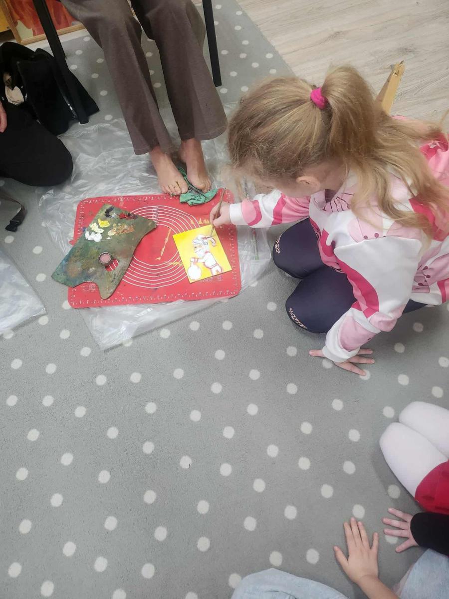 3 grudnia dzieci z grupy integracyjnej „Sówki” wzięły udział w warsztatach plastycznych z artystką malującą stopami- Panią Małgorzatą Waszkiewicz. Dzieci w całkowitym skupieniu i z pełnym podziwem obserwowały proces twórczy artystki, ale także miały szansę wspólnie z Panią Małgorzatą wykonać obraz pt. „Mikołaj”, który zawiśnie na honorowym miejscu w sali Sówek.