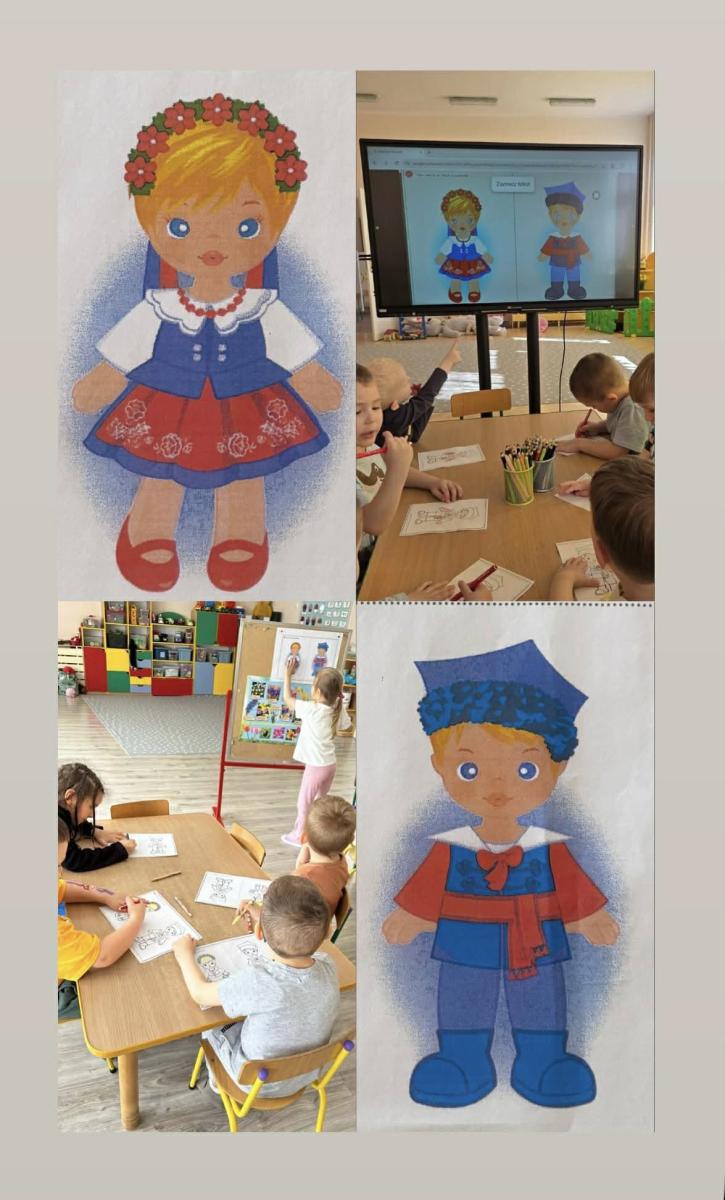 : „Strój kujawski” – kolorowanie według wzoru. Dzieci kolorowały ilustracje przedstawiające tradycyjny strój kujawski, utrwalając wiedzę o elementach stroju ludowego.